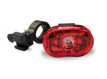 Superflash má jednu centrální 1/2Wattovou NICHIA diodou a další 2 Hi powered(1800mCD) diody. Zábleskové světlo 1/2watové diody je vidět až na 1600 metrů. Díky konstrukci je zapnuté světlo viditelné ze všech stran. Perfektní zpracování včetně tvarované těsnící gumičky. Blikačka je dodávána včetně 2 kvalitních alkalických baterií AAA a tří typů držáků pro připevnění na různé části jízdního kola nebo opasek. Svítivost při blikání 190hodin a při stálém svícení 30hodin.